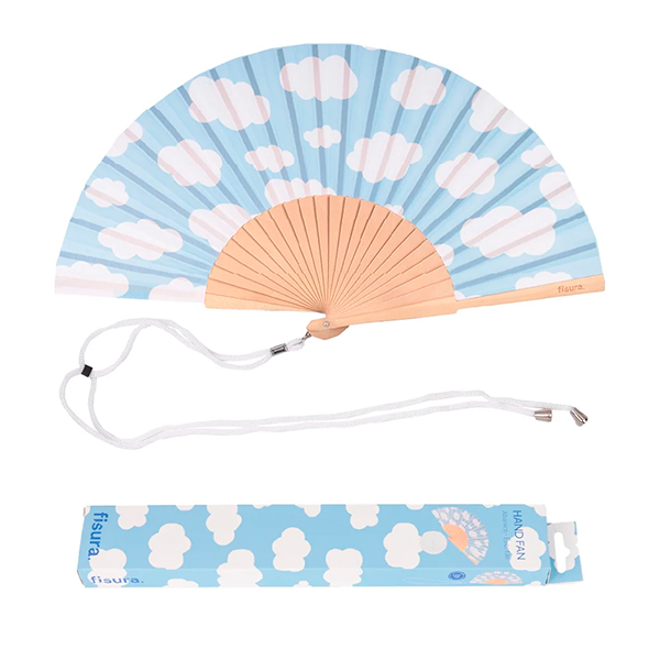 El Abanico Nubes combina frescura, diseño y sostenibilidad. Azul cielo con nubes blancas, madera FSC y un colgador práctico para que lo lleves contigo a todas partes. 💙