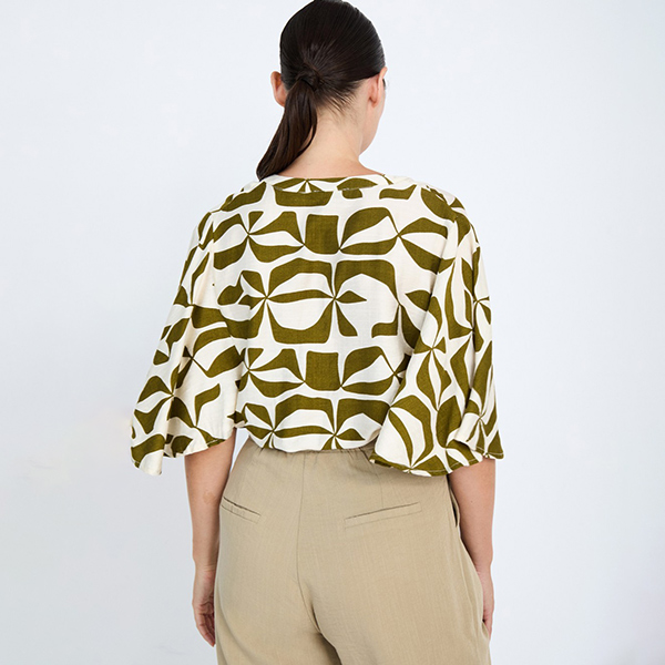 Esta camisa es la prueba de que un estampado puede cambiarlo todo. Mantiene el mismo diseño fluido y favorecedor, pero esta vez en una combinación de tonos verde oliva y blanco que aporta un aire más natural, elegante y sofisticado. Un estampado abstracto con inspiración orgánica que encaja perfectamente en looks relajados pero con intención.