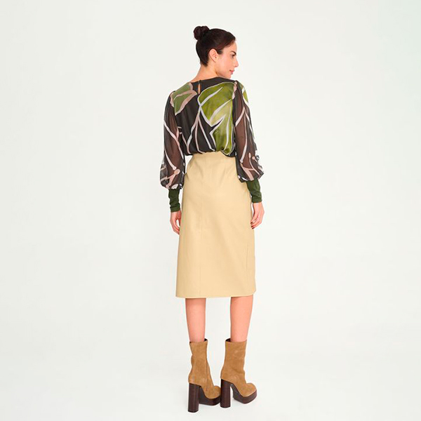 La Autofilia Camisa es semitransparente con estampado artístico en tonos verdes, manga abullonada y caída fluida. Una prenda especial y elegante diseñada por la firma española Malalá. Ideal para elevar cualquier look con un toque sofisticado y creativo.