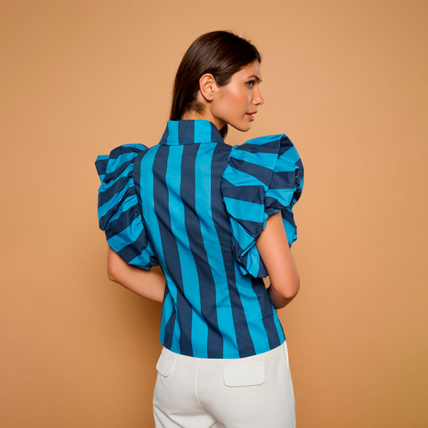 La camisa Balear fabricada en tejido de mezcla de algodón, manga corta abullonada con detalle de volantes en los hombros. Camisa con cuello solapa y cierre delantero con botodes. Además un estampado que nos encanta, rayas en diferentes tonalidades de azul.