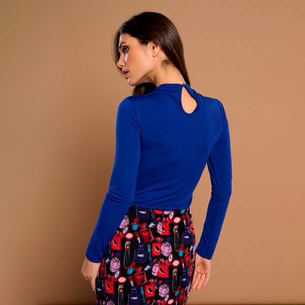 El Blue Diva Top de tejido elástico de manga larga con cuello redondo y detalle de escote cruzado y fruncido lateral que hace que siente de maravilla. Con un color azul que es perfecto para combinar con cualquier pieza de la colección. Cierre trasero con botón.