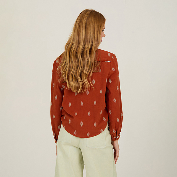 La Blusa Estampada Vivo Burnt Sierra en color caldera con un corte romántico clásico, con un detalle de vivo decorativo en el delantero en color blanco/plata. Camisa con cuello mao y manga larga, con puño fruncido. Cierre delantero con botones y detalle de estampado geométrico etnico en color dorado que sin duda te va a encantar.