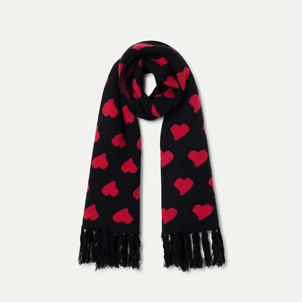 La Bufanda Heart Attack Small de punto con flecos en los extremos de color negro con un bonito estampado de corazones rojos sobre fondo negro es uno de nuestros regalos o auto regalos favoritos. Palabrita.