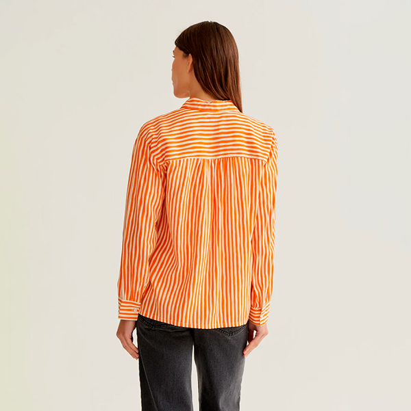 Esta camisa con estampado de rayas imperfectas naranjas es sin duda una de nuestras camisas favoritas. Con cuello camisero y manga larga con puño. Cierre delantero con botones. De corte holgado esta fabricada en un tejido fluido .
