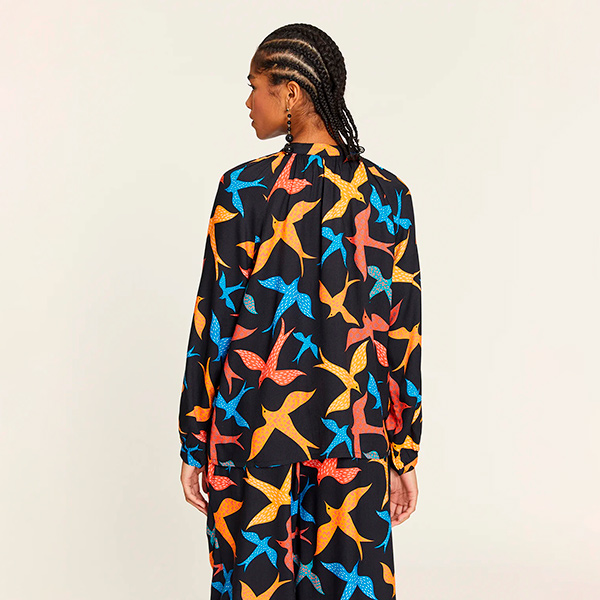 Esta camisa de corte amplio en tejido fluido y con caida es perfecta para combinar con cualquiera de las prendas de la colección de Pepa Loves. Camisa con cierre delantero con botones en la misma tonalidad. Manga larga recta con puños fino. Además su estampado nos encanta un bonito estampado de pajaros que animará hasta los días más grises.