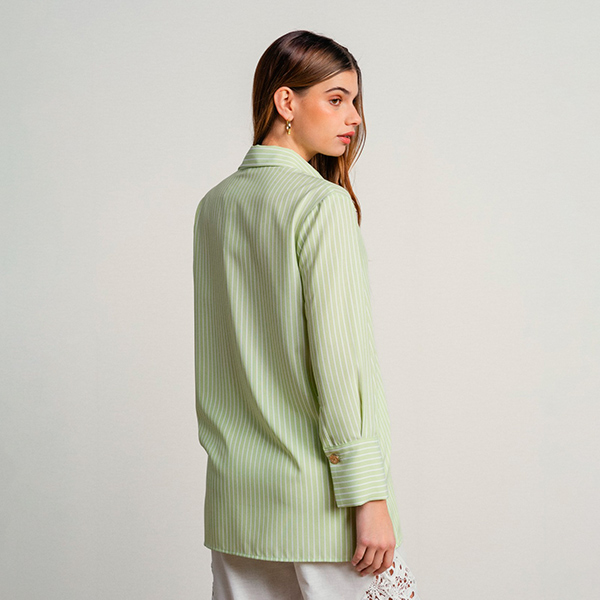El estampado de rayas verticales estiliza visualmente la silueta y suma un toque sofisticado, mientras que el cuello clásico combinado con escote en V le da un punto femenino y favorecedor. El cierre frontal permite jugar con el estilo: más formal cerrada, más desenfadada abierta o ligeramente desabrochada.
