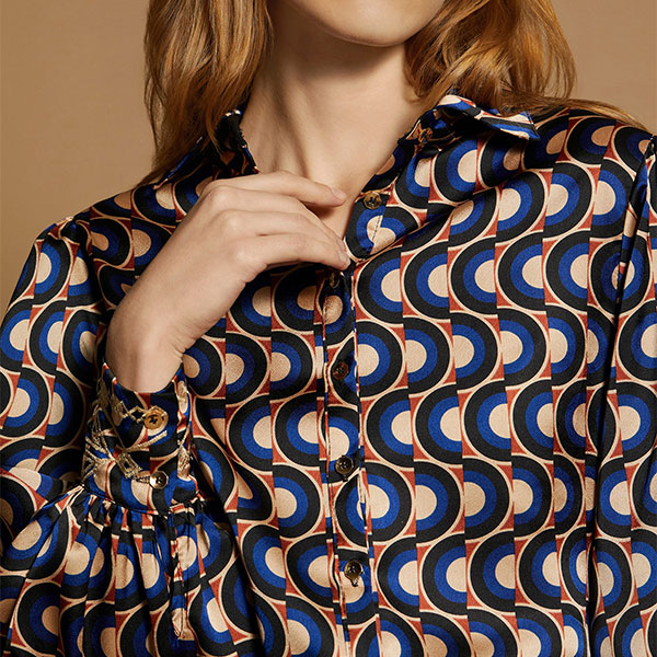 Esta fabulosa camisa es sin duda una de nuestras favoritas, con un estampado geométrico vintage de semicírculos, con un detalle de bordado dorado tanto en los puños como en la parte de atrás. Camisa con cuello con solapa y mangas XXL abullonadas. Cierre delantero con botones dorados . Esta camisa es perfecta para completar el look con los pantalones del mismo estampado.