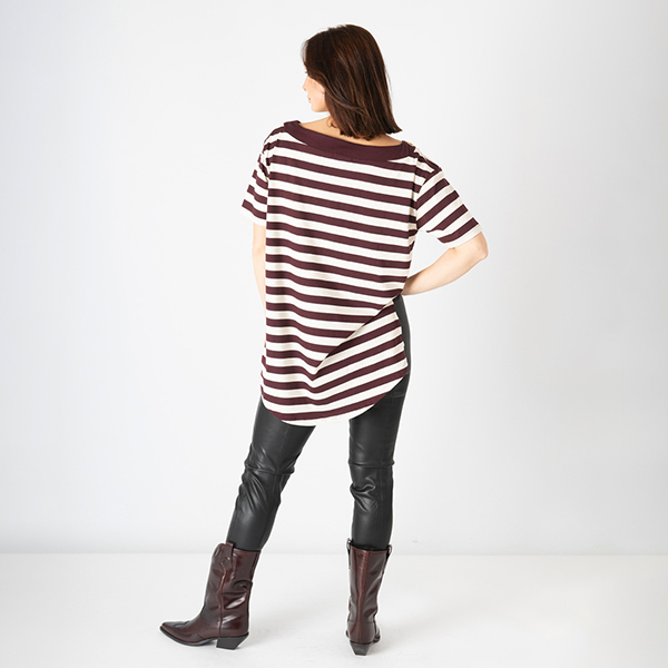 Esta camiseta de rayas y escote redondo y manga corta es un MUST. Camiseta de corte oversize y sisa baja. Con mensaje en el delantero en dorado y detalle de ollaos dorados en el escote. Es más larga por detrás que por delante lo que hace que siente de maravilla.