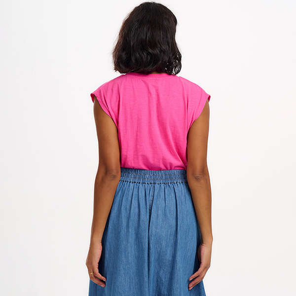 Esta camiseta con mangas a la sisa , tiene corte oversize y escote en pico. Con un bonito bordado en el delantero sobre fondo fucsia está hecha 100% algodón orgánico. Perfecta para combinar con vaqueros, shorts o faldas, para una tarde de cine, compras o reunión improvisada con tus amigas.