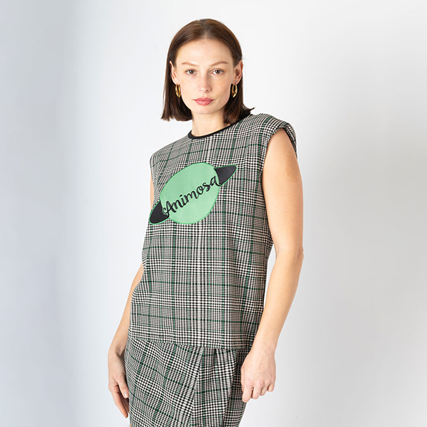La Camiseta Planeta Animosa de cuadros y detalle de líneas en verde, sin mangas y cuello redondo. Con grabado en el delantero del planeta Animosa, inspirada en Caroline Herschel. un homenaje a Bette Davis, astrónoma alemana que identificó una gran cantidad de estrellas, cometas y constelaciones del sistema solar.