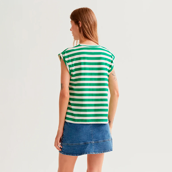 Si buscabas una camiseta que te vas a ponerte una y mil veces… ¡detente! este básico de Compañía Fantástica es INFALIBLE. Es de tejido 100% algodón de color beig con print de rayas verdes y un bonito tulipán en el delantero, escote redondo y manga corta abierta.Perfecta para animar cualquier look.
