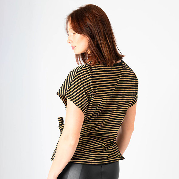 La Camiseta Rock Star Wood Rayas de escote en redondo y manga corta es un MUST. Camiseta de corte holgado y largo con detalle en el delantero y opción de poder anudártela lo que sin duda le dará un rollazo. Confeccionada con hilo de lúrex, anudada en un costado y con la frase «Rock Star Wood».