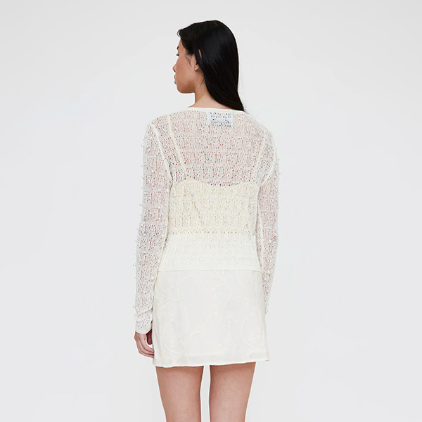 Cárdigan con tejido de punto calado de color blanco, con detalle de perlas cosidas en diferentes tamaños por todo el cuerpo. Corte slim. Con cuello redondo y manga corta.
