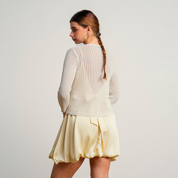 El sutil brillo del lúrex se integra de forma natural en el tejido, creando un efecto luminoso muy elegante que eleva cualquier conjunto. Su escote en pico estiliza la silueta y aporta un acabado más refinado, mientras que el cierre frontal discreto mantiene esa estética limpia y cuidada que lo hace tan versátil.
