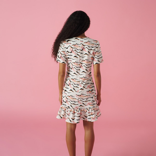 El Carmel Dress es un vestido corto con base blanca y un alegre estampado en tonos rosa, negro y salmón que no pasa desapercibido. Su corte entallado en pecho y cintura realza la silueta, mientras que la falda con caída y ligero vuelo, rematada con un coqueto volante, aporta frescura y movimiento.