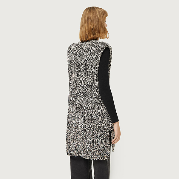 Este chaleco largo está hecho en punto grueso de color blanco y negro, perfecto para esos días de frio y para animar tu look. Con cuello redondo y sin mangas. Además de unas oberturas laterales.