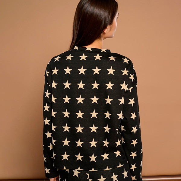 El Jersey Estrella con un estampado llenito de estrellas beige sobre fondo negro. Cuello redondo, puños y bajo en rib. Manga larga y corte amplio. Este jersey es perfecto para completar cualquier look. Puedes complementarlo con los pantalones del mismo estampado.