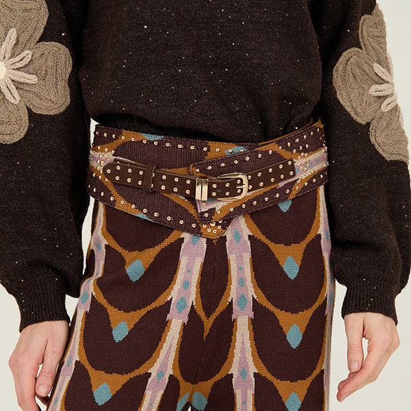 Esta es, palabrita, el fajín perfecto para completar cualquier look. Fajín ancho, tiene un corte asimétrico y detalle de tachuelas en el delantero. Goma en la parte de atrás lo que lo hace más cómodo y fácil de combinar. Cinturón ancho que se cierra delante con hebilla.