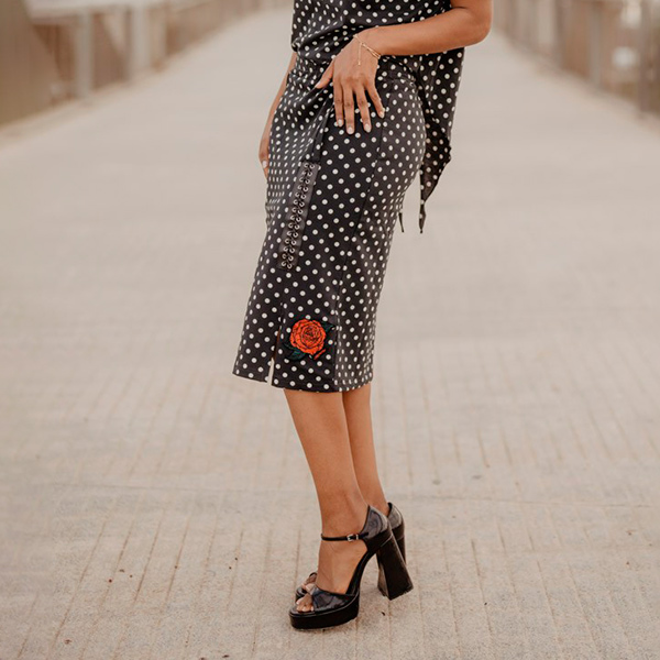 Esta falda en color negro con lunares blancos y llenita de detalles es una autentica obra de arte. Bolsillos en el delantero y obertura en el bajo.  Goma en la cinturilla lo que la hace muy cómoda. Y detalles de cordónes cruzados con remates de cuero y rosa bordada en el delantero.