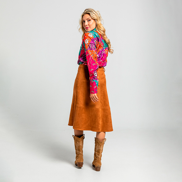 La falda pertenece a la colección FREEDOOM porque no hay mayor sensación de libertad que galopar a contracorriente, dispuesta a darlo todo o vivirlo todo, una colección que viene a recordarnos que somos almas libres. Y como nos gusta a nosotr@s los estampado de Lolina. La falda midi de tiro alto con trabillas tiene detalle de bajo evasé lo que le da la sensación de vuelo. Un corte básico que sienta de maravilla con cierre con cremallera lateral invisible.