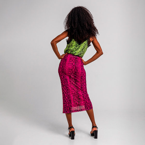 La Falda Tubo Ajustada Veneno midi de tejido elástico que nos FLIPA. Modelo de talle alto con elástico en la cintura y tejido semitransparente con estampado de serpiente bicolor.