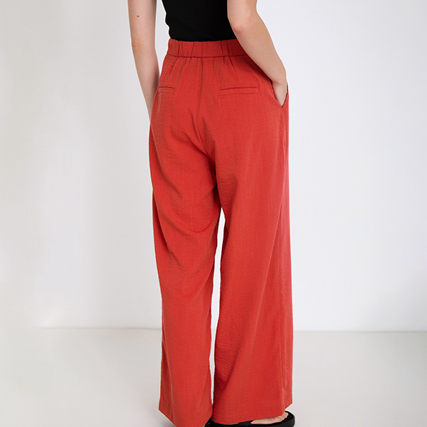 El color grenadine, vibrante y lleno de personalidad, convierte este pantalón en el protagonista absoluto del look. Perfecto para combinar con básicos neutros o jugar con contrastes más atrevidos.
