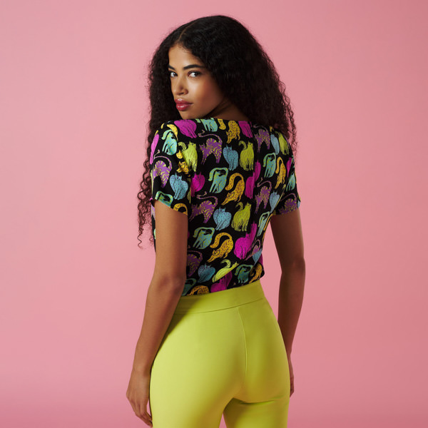 El Karen Top es una camiseta de manga corta y cuello redondo, con una base negra que resalta su original estampado de gatos en tonos flúor.