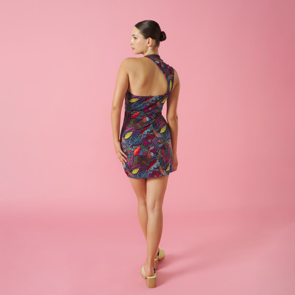 El Kehlani Dress es un vestido corto que destaca por su escote asimétrico y su espalda descubierta, diseñado para robar miradas con cada giro. Su tejido elástico se adapta al cuerpo realzando la silueta, mientras que el estampado de hojas multicolor sobre fondo oscuro convierte esta prenda en un auténtico festival de color.