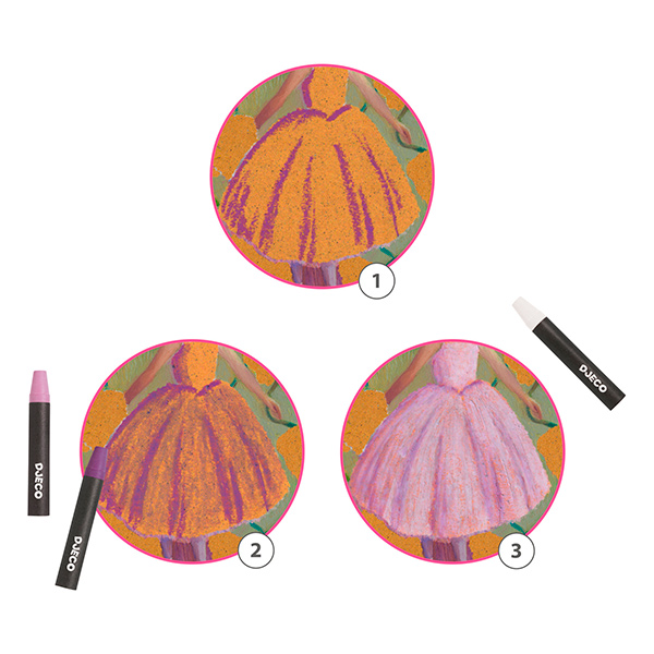 Inspirado en el impresionista Edgar Degas, la artista Nathalie Novi ha creado esta actividad de pintura con ceras. En ella, se agregan colores gradualmente, superponiéndolas para crear sombras y luz en los pliegues y las telas. Estas ceras se pueden usar como pasteles al óleo, un material muy pigmentado de colores intensos. ¡Nos flipa esta manualidad!