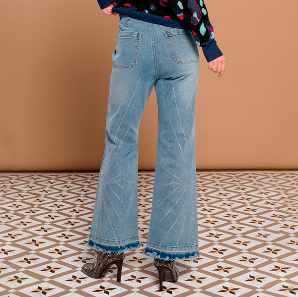 Los Lelia Jeans en un azul lavado de tiro alto. Vaqueros llenitos de detalles, pernera ancha wide leg con terminación acampanada. Cierre frontal con botones y cremallera. Bolsillos en el delantero de parche y detalle de estrellas y rayas en strass.