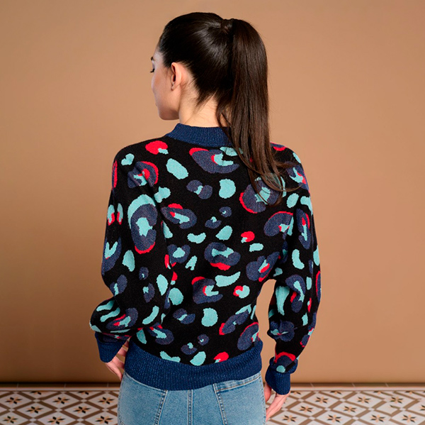 El Leo Sweater con un fabuloso estampado animal print con su poquito de brilli-brilli que tanto nos gusta. Jersey de punto elástico con cuello redondo alto, puños y bajo en rib en contraste.  Este jersey es perfecto para completar cualquier look.