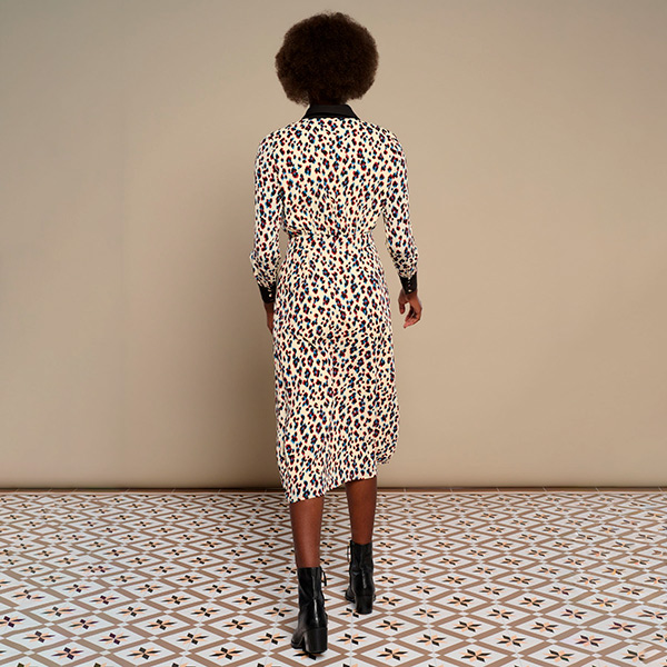 El Leontina Dress es un camisero con cuello solapa y puño en color negro. Manga larga Slim, forro interior y cierre delantero con botones. Además su estampado sin duda es uno de nuestros favoritos. Un animal print multicolor sobre fondo beige.