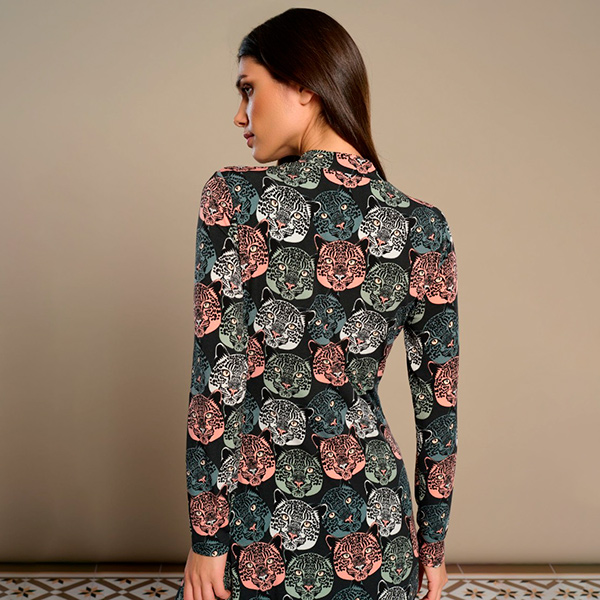 El Minina Dress tiene un estampado de guepardos en bonitos colores verdes, negros y salmón. Vestido largo, de manga larga, cuello redondo en tejido elástico tanto el vestido como el forro lo que lo hace muy cómodo.