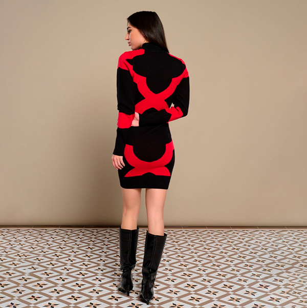 El Mosaic Dress de punto elástico corto con cuello alto, manga larga y detalle de puños XXL. Cuello, puños y bajo en rib. Además que decir de su estampado, que nos encanta así sin más, un estampado en color rojo sobre fondo negro.