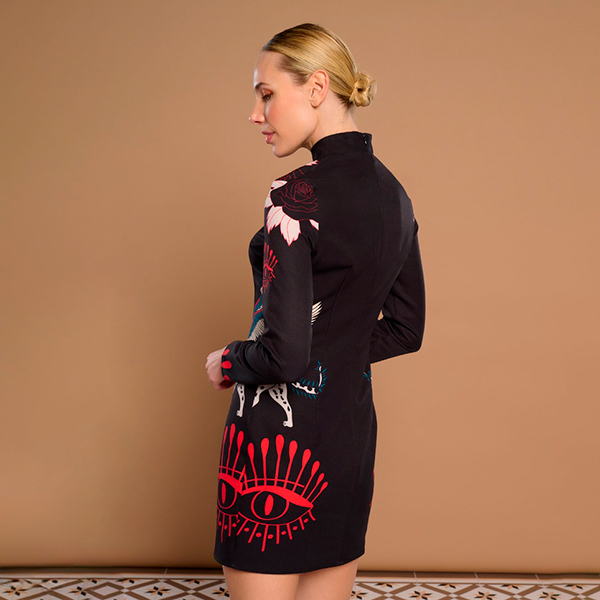 El vestido tiene el estampado más místico de la temporada, gatos alados, corazones y ojos egipcios sobre fondo negro, te va a encantar. Vestido corto, de manga larga, cuello perkins con cremallera oculta y forro. Lo que lo hace perfecto para elevar cualquier look.