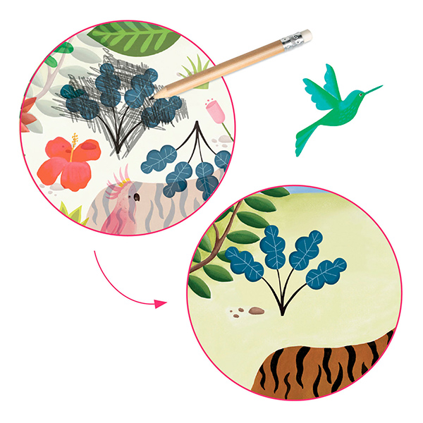 Inspirado en maestro del Arte Naíf Rousseau, el artista Bex Parkins ha creado esta actividad de calcomanías para acercarte a su arte. Tan solo tienes que ir agregando y superponiendo calcomanías hasta componer un total de 4 cuadros que representan animales salvajes escondidos tras la exuberante naturaleza. ¡Prepárate para pasar un buen rato con esta manualidad!