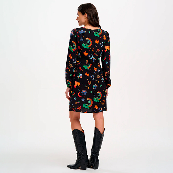 Este vestido de cuello redondo, mangas larga ligeramente abullonada y con goma. Además tiene un corte en la cintura que hace que siente de maravilla y un cinturón cosido a la cintura que podrás anudarte delante a modo cinturón o utilizarlo para ajustártelo detrás como tu prefieras. Este diseño de fondo negro en el que tienen cabida todos los signos del zodiaco seguro que hace subir tu vibra.
