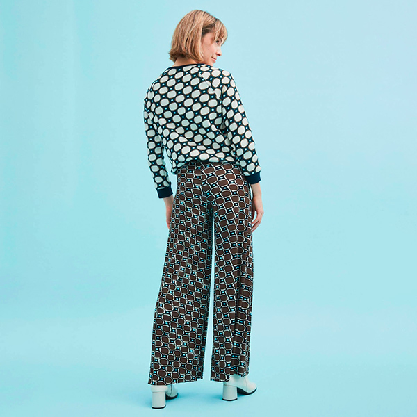 Este pantalón esta confeccionado en un tejido elástico muy dulce al tacto que hace que sienta genial y resulte comodisimo. Su pernera recta y ancha junto con su estampado geométrico le dan un toque retro que nos encanta. Uno de nuestros FAVS sin duda.