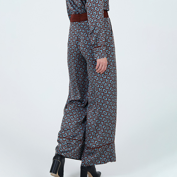 Este pantalón fabricado en tejido satinado con estampado abstracto en color marrón sobre fondo azules sin duda uno de nuestros favoritos de la temporada. Cinturilla en contraste con jaretas. Bajo con vivo en relieve en el contraste. Corte recto y cierre con cremallera oculta en la parte trasera. Puedes completar este pantalón con la blusa del mismo estampado.