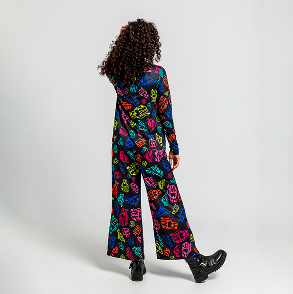 Esta pantalón pertenece a la colección We are connected: porque esta colección viene a recargarnos las pilas. Este robotito es obra de uno de los maravillosos niños del centro de acogida de Granada al que irán destinados parte de los beneficios y como nos gustan a nosotras los estampados de Lolina. El pantalón de tiro alto en tejido fluido y con un corte on Flare. Su pantalón ancho y goma en la cinturilla.