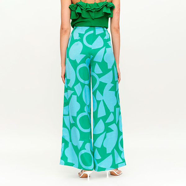 El Pantalón Geo Verde es de pierna amplia con estampado geométrico en tonos verdes y azules. Cómodo, fluido y lleno de personalidad para looks que no pasan desapercibidos.