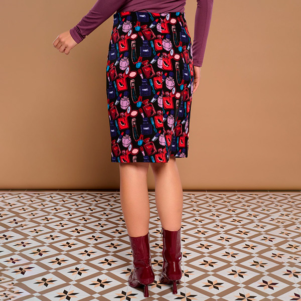 El Paola Skirt cierre trasero con cremallera oculta, forro interior y obertura en la parte de atrás. Con un estampado llenito de productos cosméticos que seguro te va a gustar tanto como a nosotras, sobre fondo negro.
