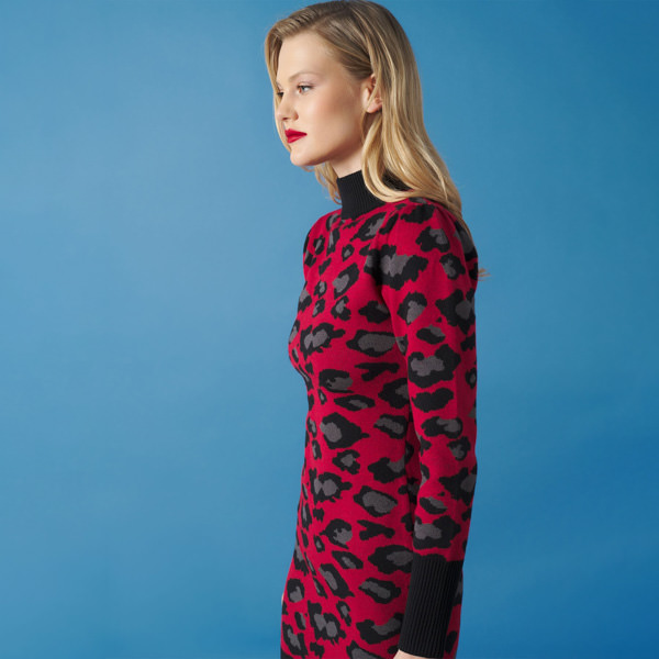 El Red Leo Dress de punto elástico corto con cuello alto, manga larga y detalle de puños XXL. Cuello, puños y bajo en rib. en contraste. Además que decir de su estampado, que nos encanta así sin más, un animal print en color rojo.