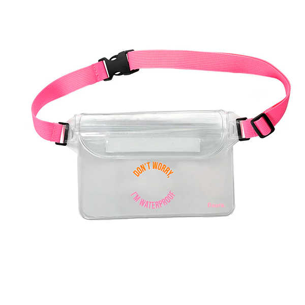 Está fabricada de PVC, polipropileno y velcro. Esta riñonera es 100% impermeable. Con sus llamativos colores y su mensaje “Don’t worry, I’m waterproof” .