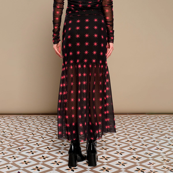 Esta falda larga de tejido elástico en tul es perfecta para elevar cualquier look. Detalle de volante semitransparente y cierre lateral con cremallera invisible. Su estampado, simplemente es MA-RA-VI-LLO-SO, un bonito estampado de estrellas sobre fondo negro.