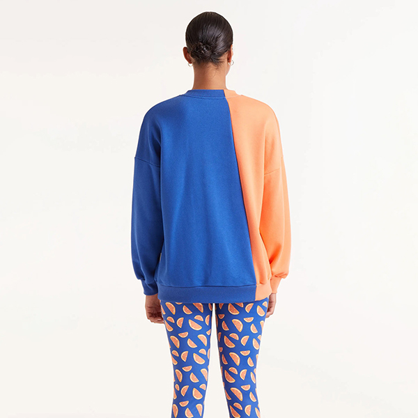 La Sudadera Bicolor Azul de felpa de algodón bicolor en color naranja y azul con detallazo en naranja en el delantero. Con cuello redondo y manga larga. Detalle de acabados en rib. Composición 100% algodón.