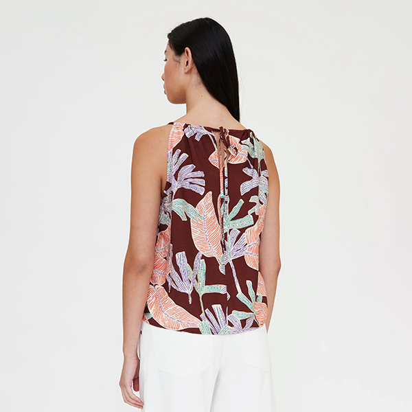 El Top estampado Manglar de color marrón con tejido crepé de un manglar. Escote redondo con tirantes de lazada finos que podrás ajustarte a la parte de atrás a tu gusto. Un top cortito que podrás combinar con cualquier prenda de la colección.
