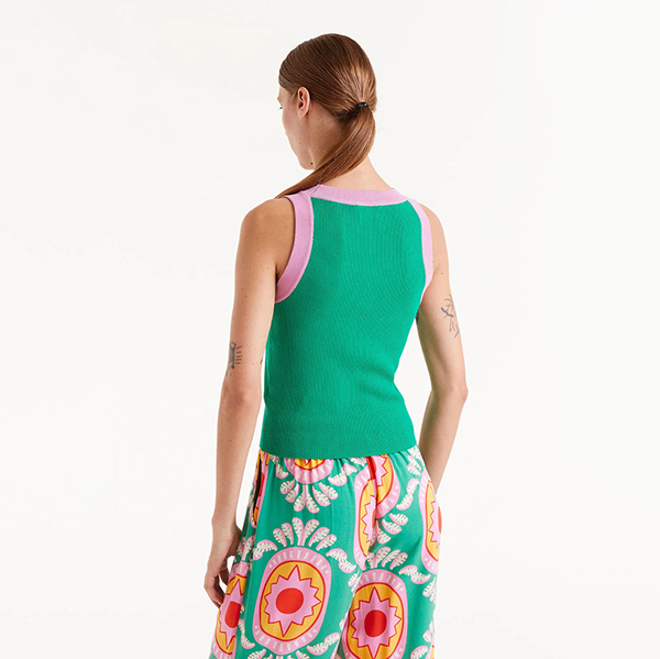 Si buscabas un jersey fresquito y que vas a ponerte este verano una y mil veces… ¡detente! este básico de Compañía Fantástica es INFALIBLE. Es de tejido de punto con escote redondo y sin mangas en contraste. De un bonito color verde y detalles rosas.