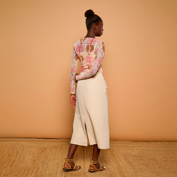 El Vanai Skirt larga de tiro medio. Esta llena de detalles que lo hacen FA-BU-LO-SA. Detalle de obertura trasera, bolsillos laterales con solapa. Cintura elástica con lazada para que te la puedas ajustar a tu gusto. En color crema la que lo hace muy actual.