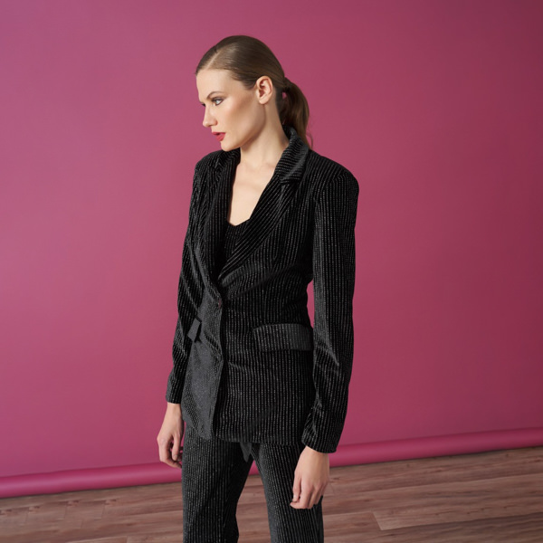 La Velvet Jacket de cuello con solapa de manga larga tiene bolsillos delanteros con solapa. Su cierre delantero con botón. En color negro con detallazo de brilli brilli como nos gusta a nosotras.